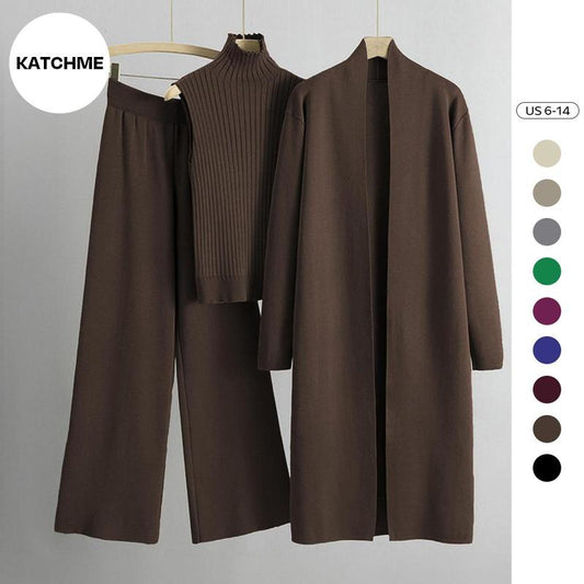 Katchme Women's Elegant Turtle Neck Tank Top and Wide Leg Trousers with Open-Front Long Cardigan Set, Solid Color Three-Piece Ensemble for Fall and Winter